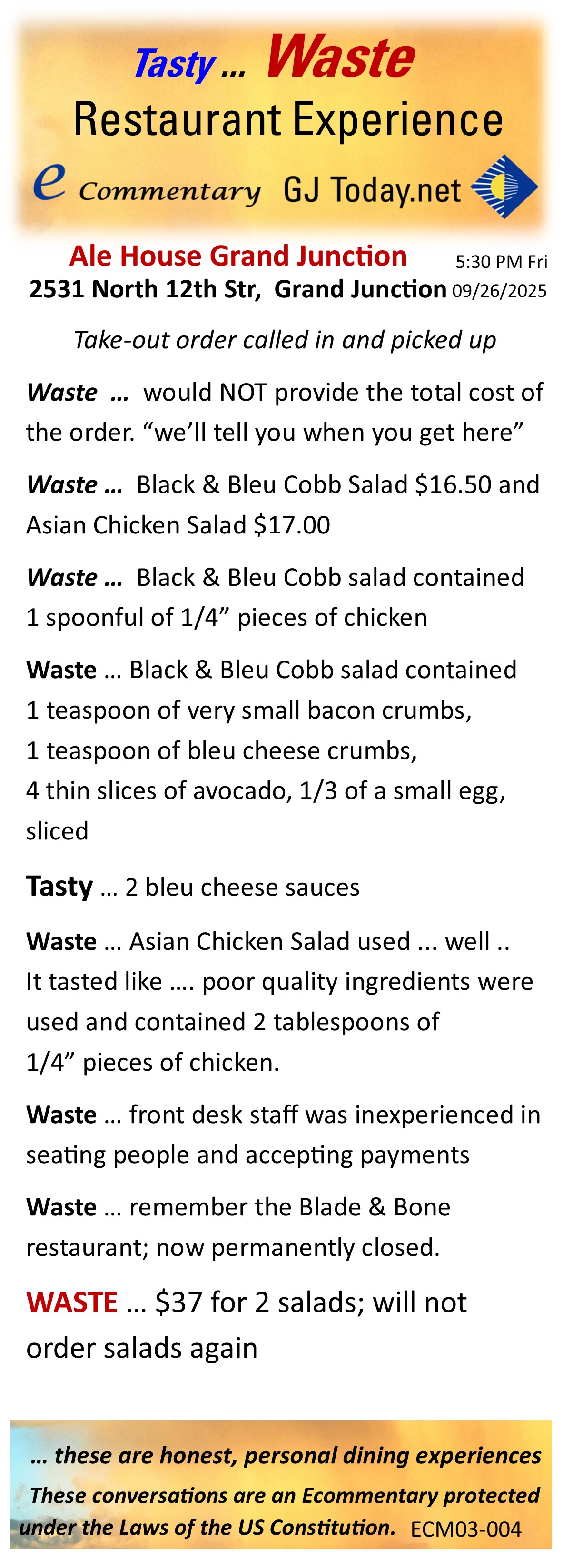 ... These Ecommentary are Restaurant Experiences by REAL People and are represented by 'Tasty ... Waste' Ecommentary